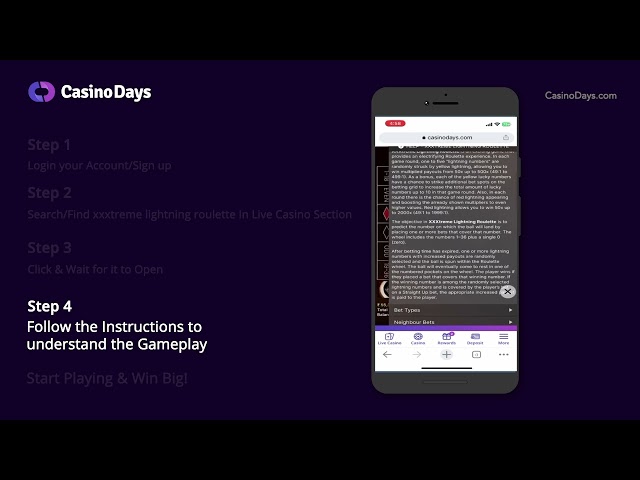 Download the free Casino Days app for Android or iOS and enjoy XXXtreme Lightning Roulette with multipliers up to 2,000x on any device. By using the mobile app, you can experience fast loading times, exclusive mobile bonuses, and the same premium live gaming quality as our desktop version. Get the app now from Google Play or the Apple App Store and start playing.