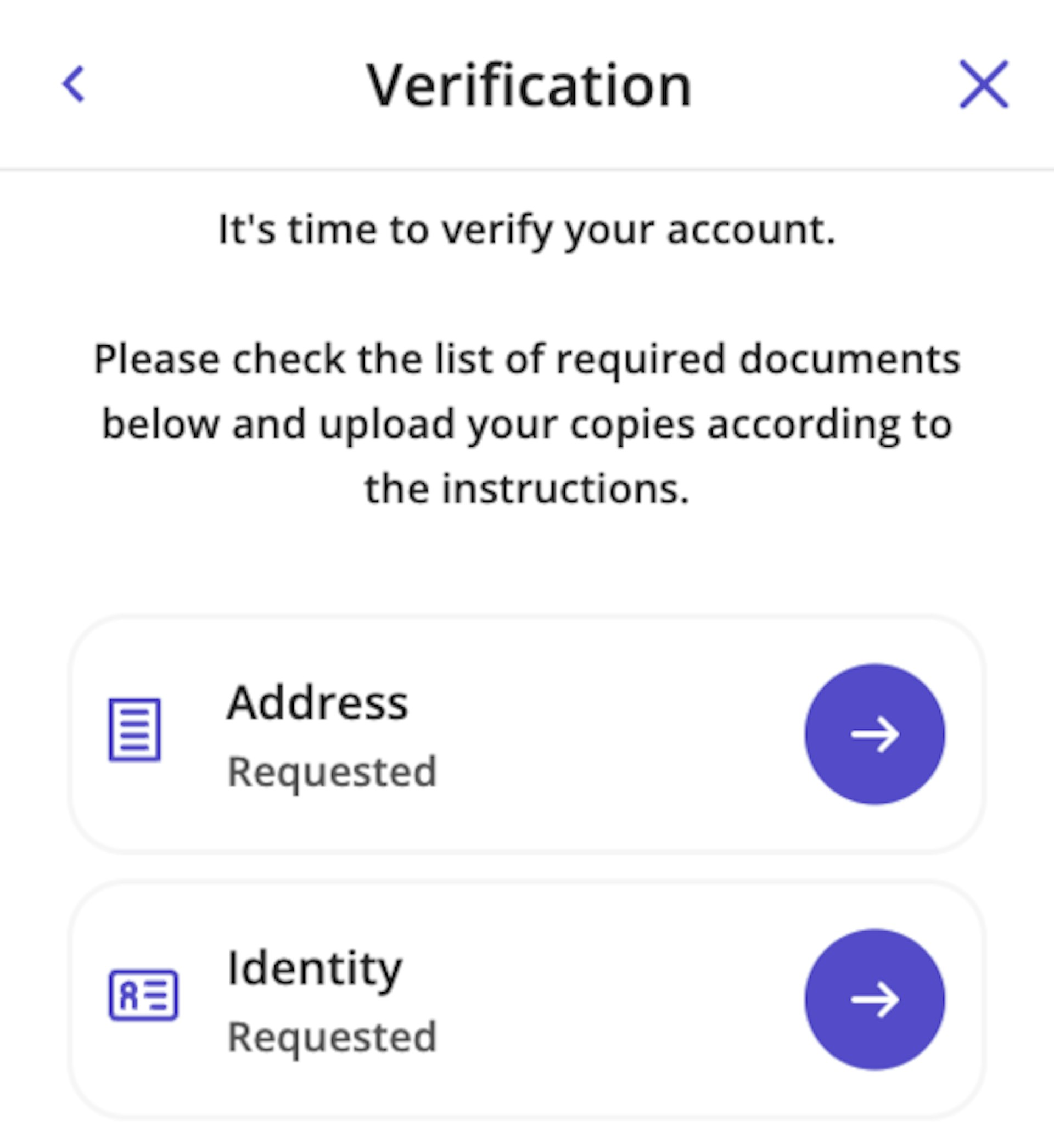 Note that you will have to have received a request to verify your account before you can upload your documents via your account. Once the request has been sent, you’ll see a “Verification needed” button at the top of the side menu. Check out the images below to see how our document processing system looks.