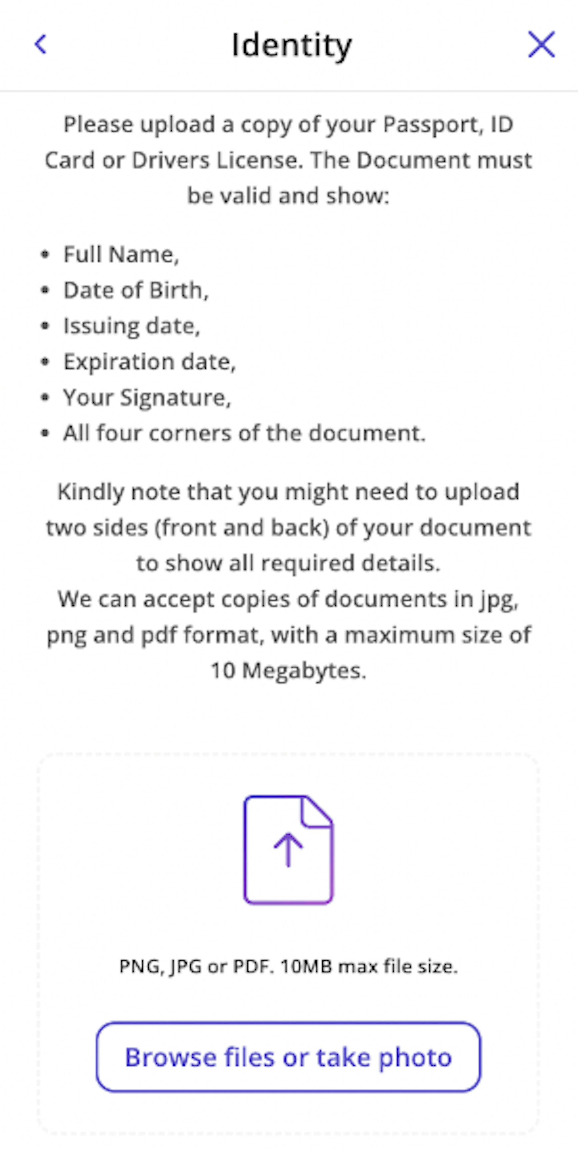 ID: Passport, ID Card, Driver’s License, Adhaar Card. The document must be valid and have a visible expiration date, and the image should show all four corners of it.