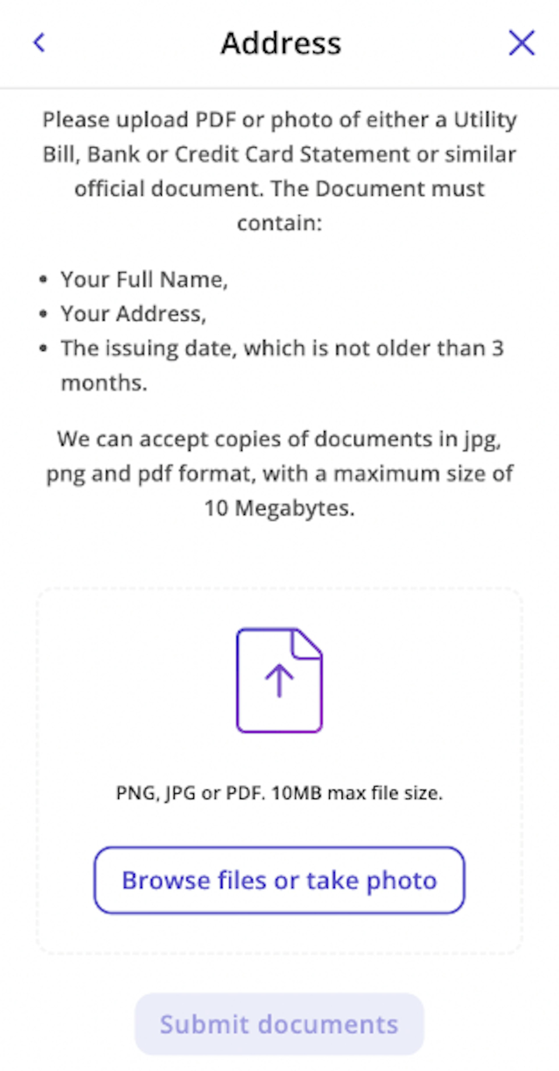 Proof of Address: A copy of a utility bill, bank statement, card statement, or anything similar issued in your name and shows your residential address. The document should be no older than three months, so an issue date will also have to be visible. There should also be a clear name and or logo of the sender. The full document should be visible (all four corners).